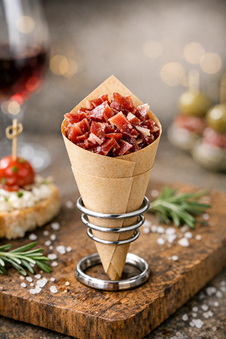Las virutas de jamón, por su formato de corte, de pequeño tamaño y ligero grosor, son un complemento ideal para todo tipo de platos, aperitivos o entrantes. Un ingrediente versátil, sabroso y con mucho estilo. Gracias a su excepcional calidad, aportan un plus de sabor inconfundible a todas las recetas. Puedes combinarlas con todo tipo de platos e ingredientes, añadiéndolas al final, si quieres mantener toda su intensidad y textura, o al principio de la preparación, si prefieres que se fundan y se integren con el resto de los sabores del plato.