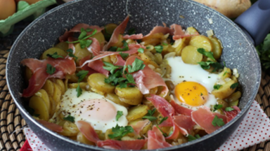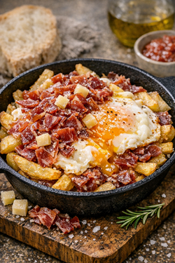 Corta y fríe patatas en daditos, y añádeles un huevo frito y un buen pellizco de virutas por encima. El jamón se derrite con la yema.